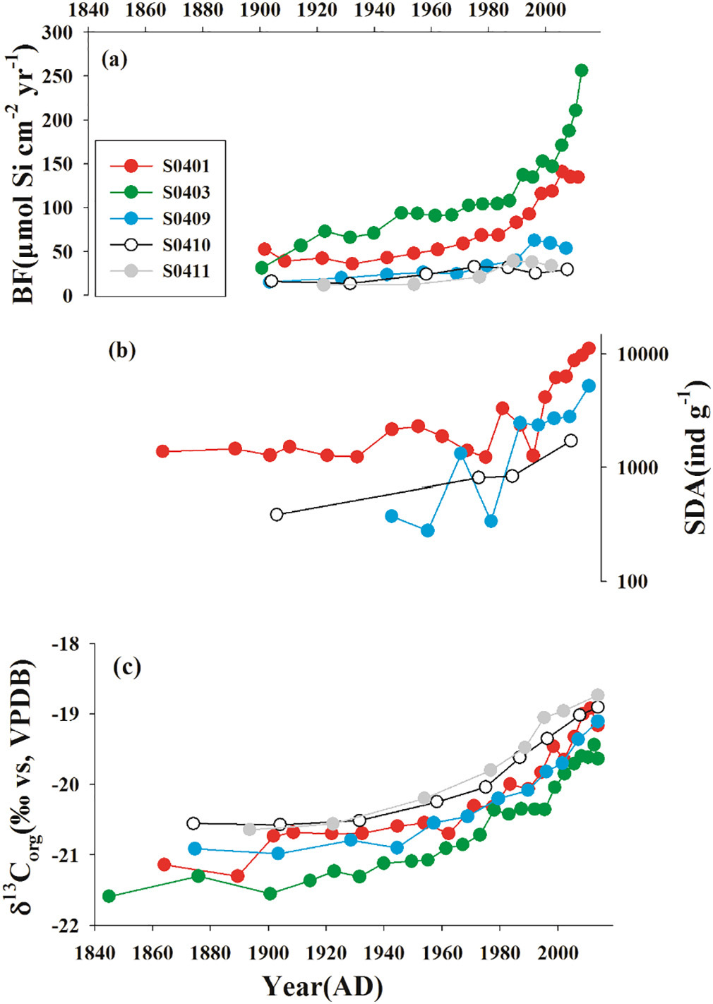 重建的历史变化 (a)生物硅的埋藏通量、(b)沉积物中硅藻的丰度、(c)沉积有机δ13C