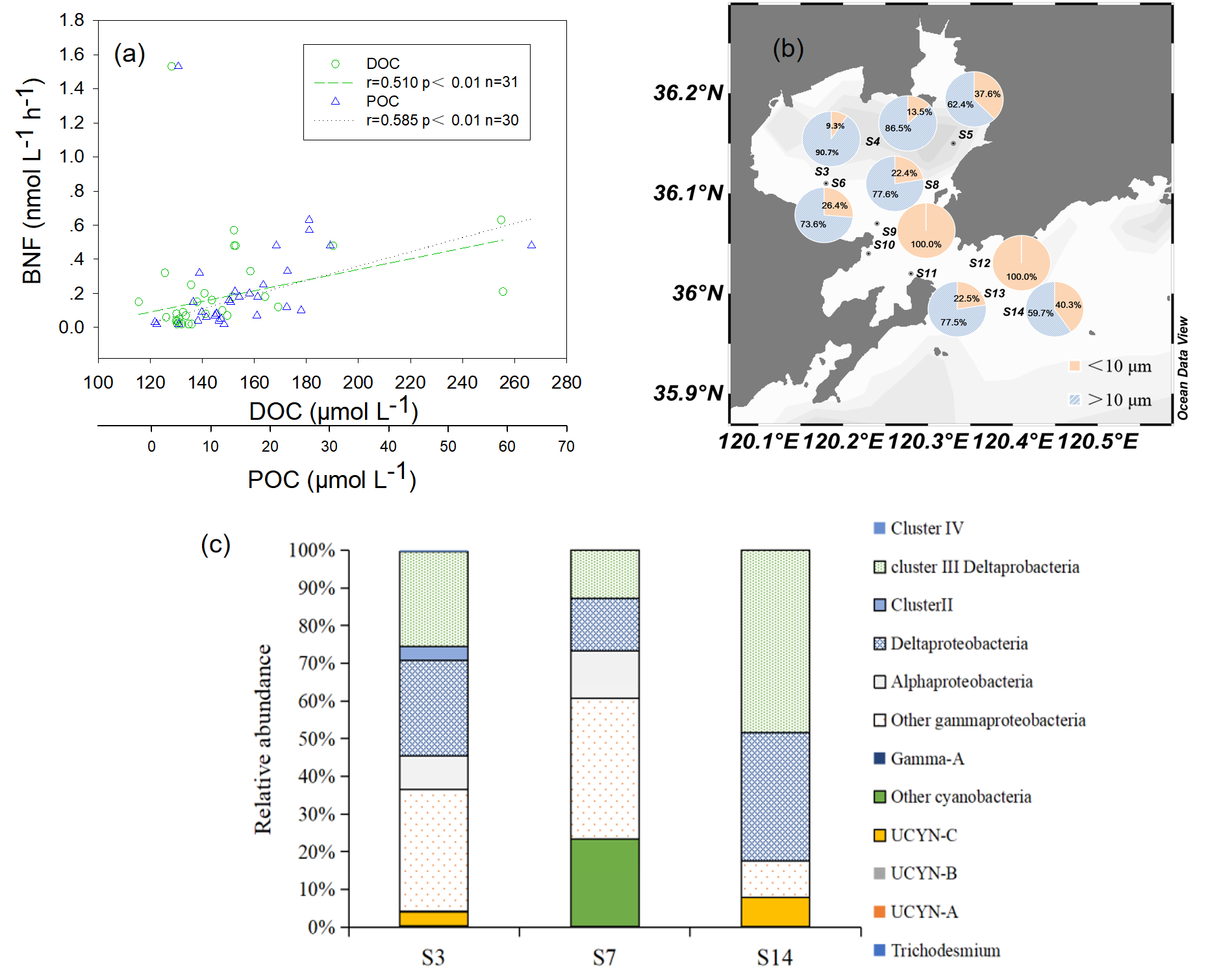 胶州湾(a)固氮速率与有机碳浓度的相关性、(b)固氮速率的粒级分布、