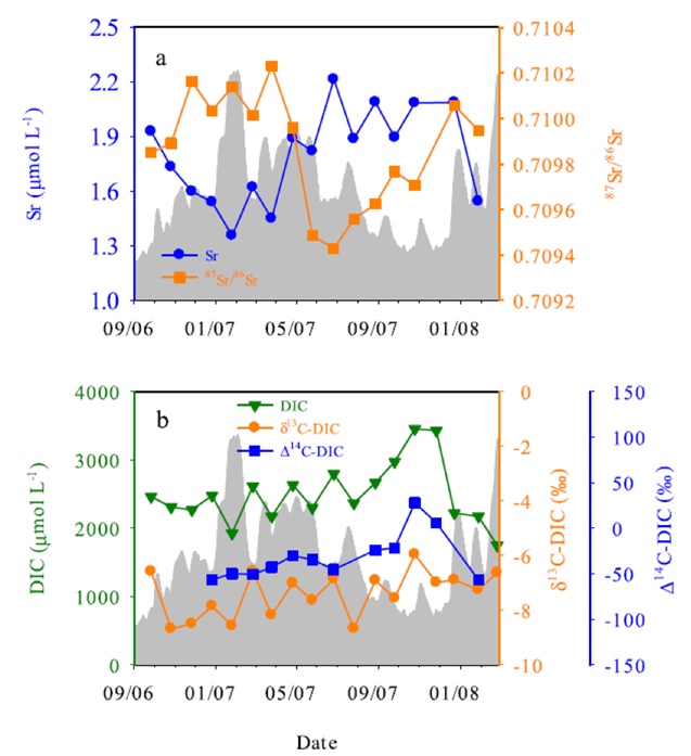 2006-2008年密西西比河下游中(a)Sr的浓度和87Sr/86Sr比值 (b)溶解无机碳(DIC)的浓度以及稳定碳(δ13C)和放射性碳(Δ14C)的同位素组成