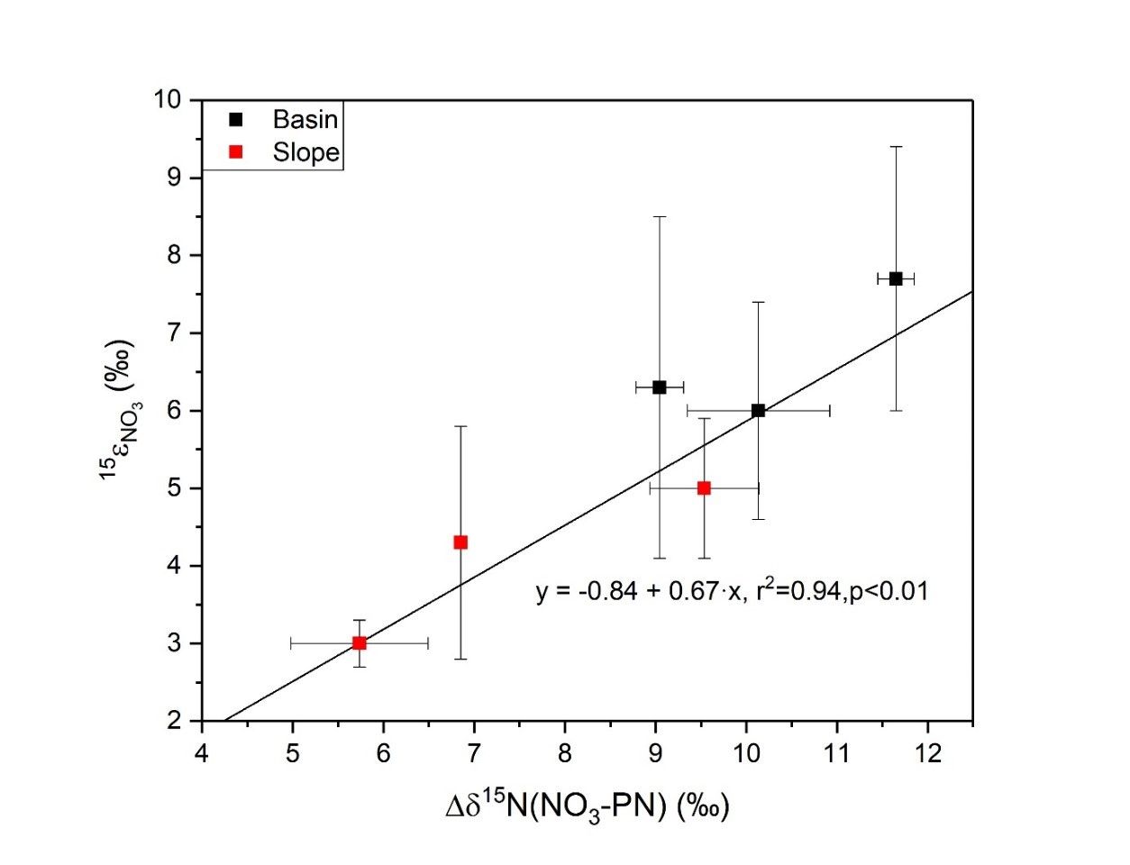 白令海陆架是全球海洋最高生产力的区域之一,而白令海陆坡和海盆则是典型的高营养盐低生物量区域,截然不同的环境特征意味着白令海陆架、陆坡和海盆区的氮循环过程可能存在差异。此前有关白令海氮循环的研究基本集中于陆架区,对陆坡和海盆区的了解很少。针对这一现状,我们开展了夏季白令海西部海域陆坡区和海盆区硝酸盐和悬浮颗粒有机物氮同位素组成的研究,旨在揭示陆坡和海盆区氮循环过程的特征。研究表明,硝酸盐δ15N由次表层向表层逐渐增加,同时伴随着硝酸盐浓度的降低,反映了浮游植物同化吸收的效应。由瑞利模型计算出的陆坡区和海盆区硝酸盐同化吸收的同位素分馏系数分别为4.1 ± 0.8‰和6.1 ± 2.1‰,其中海盆区分馏系数的空间变化可能更多地与浮游植物群落的变化有关,而陆坡区因硝化作用影响,所得的分馏系数可能被低估了。通过结合硝酸盐和悬浮颗粒物的δ15N可以发现,白令海陆坡和海盆区的初级生产力主要以再生营养盐来支持,硝化作用仅在陆坡区比较明显,原因在于其较高的生产力和较活跃的有机物再矿化作用。成果发表在Deep-Sea Research I期刊上。