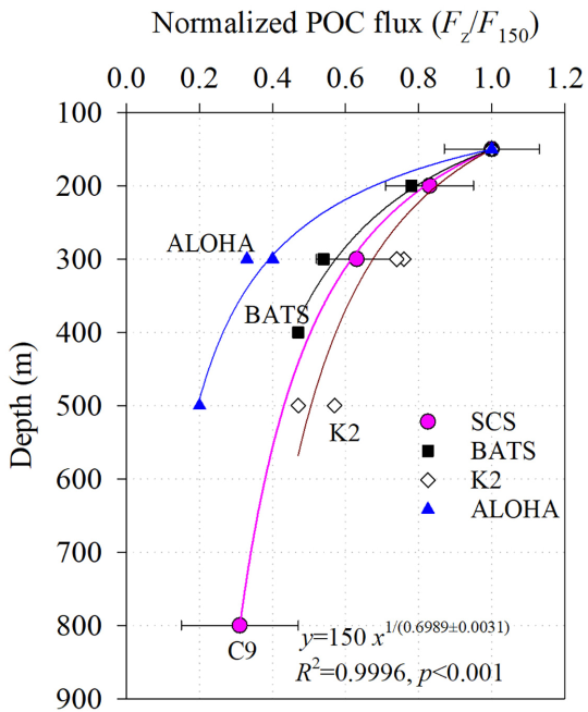 南海东北部陆坡区归一化POC沉降通量随深度的变化(南海的Martin曲线,指数为0.70 ± 0.01)