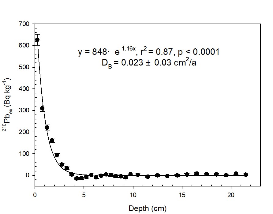 南极宇航员海沉积物岩心中210Pbex比活度的垂直变化,由此计算出的生物扰动系数为0.023 ± 0.003 cm2/a,显示出较弱的底栖生物活动