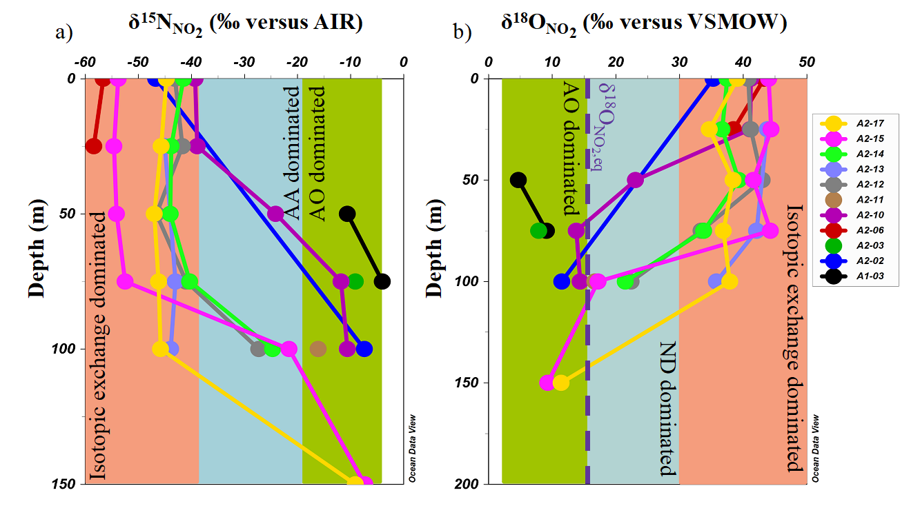 南极阿蒙森海亚硝酸盐氮、氧同位素组成的垂直分布,说明硝酸盐-亚硝酸盐同位素交换反应是导致亚硝酸盐具有异常低δ15N和异常高δ18O的原因
