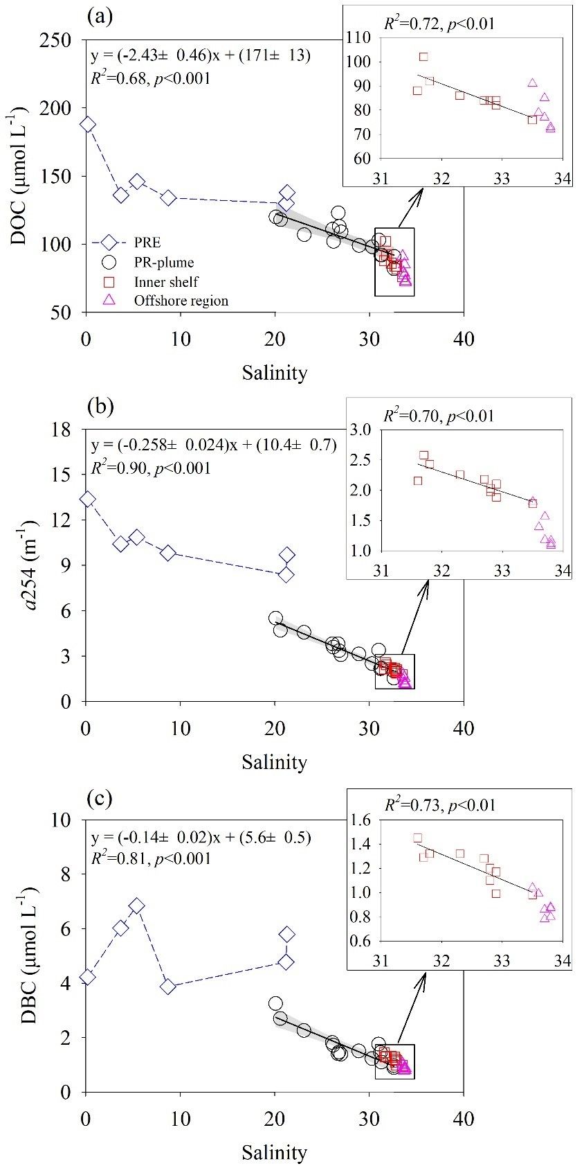 河流是海洋DBC的主要来源,河口是链接陆地和海洋的关键带,是陆源物质进入海洋的通道。DBC在河口内经历的生物地球化学行为,如光降解和颗粒物的吸附解吸等过程会改变DBC的结构和入海通量。然而,关于DBC在河口内地球化学行为的研究还十分有限。因此,为了阐明DBC在河口中的来源和迁移转化过程,选择位于中国黑碳排放热点的珠江口作为研究区域。通过对比河口上游、河口下游以及河口外部南海东北部陆架三个区域DBC、DOC和CDOM的空间变化特征,发现DOC和CDOM浓度在河口上游随着盐度增加而降低,但在河口下游随着盐度的增加DOC和CDOM浓度则有增加的趋势。DBC在整个河口内部则随着盐度的增加而增加,说明河口DBC主要由当地陆源输入贡献。在河口外部羽状流区DBC、DOC和CDOM行为趋于保守,说明在河口外部DBC主要受到河口羽状流和海水物理混合的影响。根据珠江径流量和DBC浓度,估算得到珠江口向南海东北部输出的DBC通量为11.2~16.3 Gg-C yr-1,说明珠江口输送的河流DBC是中国南海惰性有机碳的重要来源。论文发表在Journal of Oceanography期刊上。论文链接地址https://doi.org/10.1007/s10872-023-00708-2