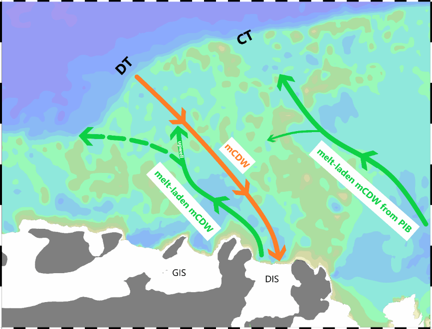 中国第36次南极科学考察航次期间,对阿蒙森海冰间湖A、B两个断面开展了海水δ18O、226Ra和228Ra的研究,利用盐度和δ18O的质量平衡关系计算获得大气降水(MW)和海冰融水(SIM)的含量,同时通过盐度和溶解氧含量计算出50 m以深冰架融水(GMW)的含量。MW、SIM和GMW的断面分布表明,GMW从Doston冰架(DIS)沿西南方向往外海输运,输运过程中沿27.45和27.40等密度面逐渐向上抬升;ASP东部陆架的GMW除了Doston冰架的来源外,可能还存在Pine Island Ice Shelf等其他东部冰架的贡献。表层海水228Ra和226Ra的空间变化同样反映出携带了GMW的变性绕极深层水(mCDW)向外海输送的路径,并且指示出GMW在A断面中部可能上升到了表层。携带GMW的mCDW在回流过程中的抬升与海冰形成过程释放的盐卤水密切相关。海水结冰产生的盐卤水数量影响到ASP等密度面的空间变化,在盐卤水累积多的站位,27.40和27.45等密度线变浅,而在盐卤水积累少的站位,等密度线变深。据此,可以确定ASP中GMW的来源和运动路径如下:mCDW在艾克曼输运作用下进入ASP,与DIS冰架接触并引起冰架底部融化,之后,携带了GMW的mCDW沿着27.40和27.45等密度面之间的深度向外海流动,期间不断抬升并在ASP中部区域上升到表层。另外,来自PIB(Pine Island Bay)的GMW可能对ASP东部的GMW也有部分贡献。成果发表在Progress in Oceanography期刊上。论文链接地址https://doi.org/10.1002/2015JC011211
