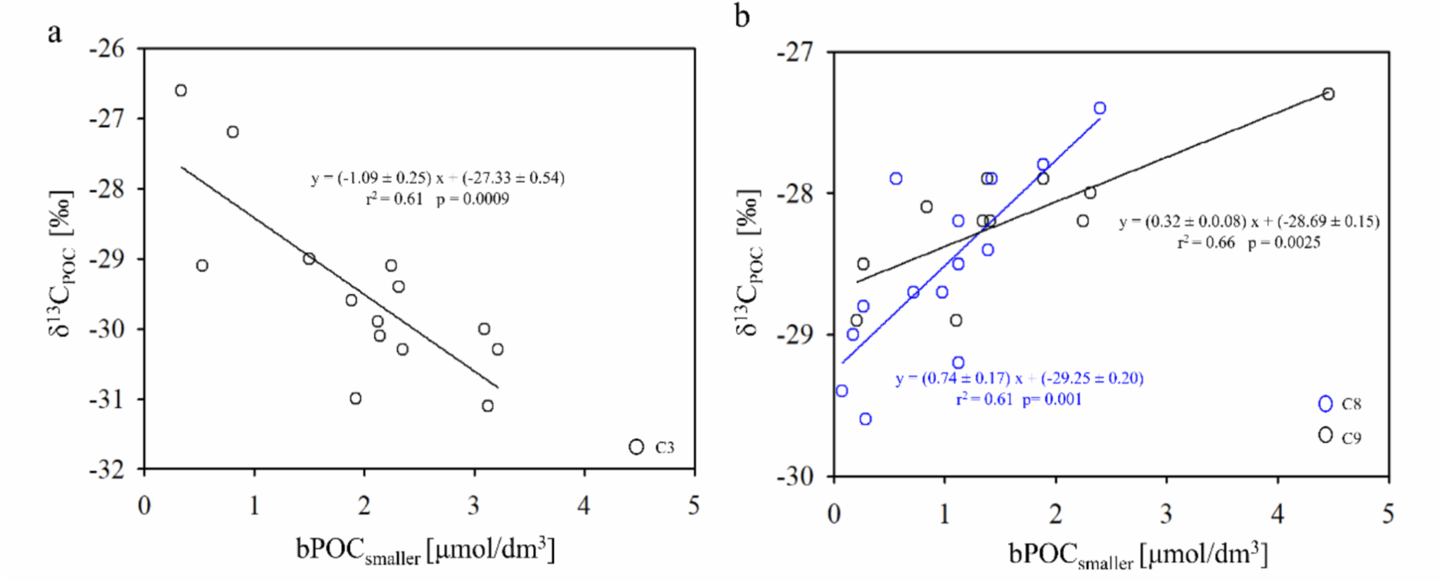 2019年12月混合层中悬浮颗粒有机物δ13C和小粒级生源POC含量的关系(左:宇航员海;右:合作海)
