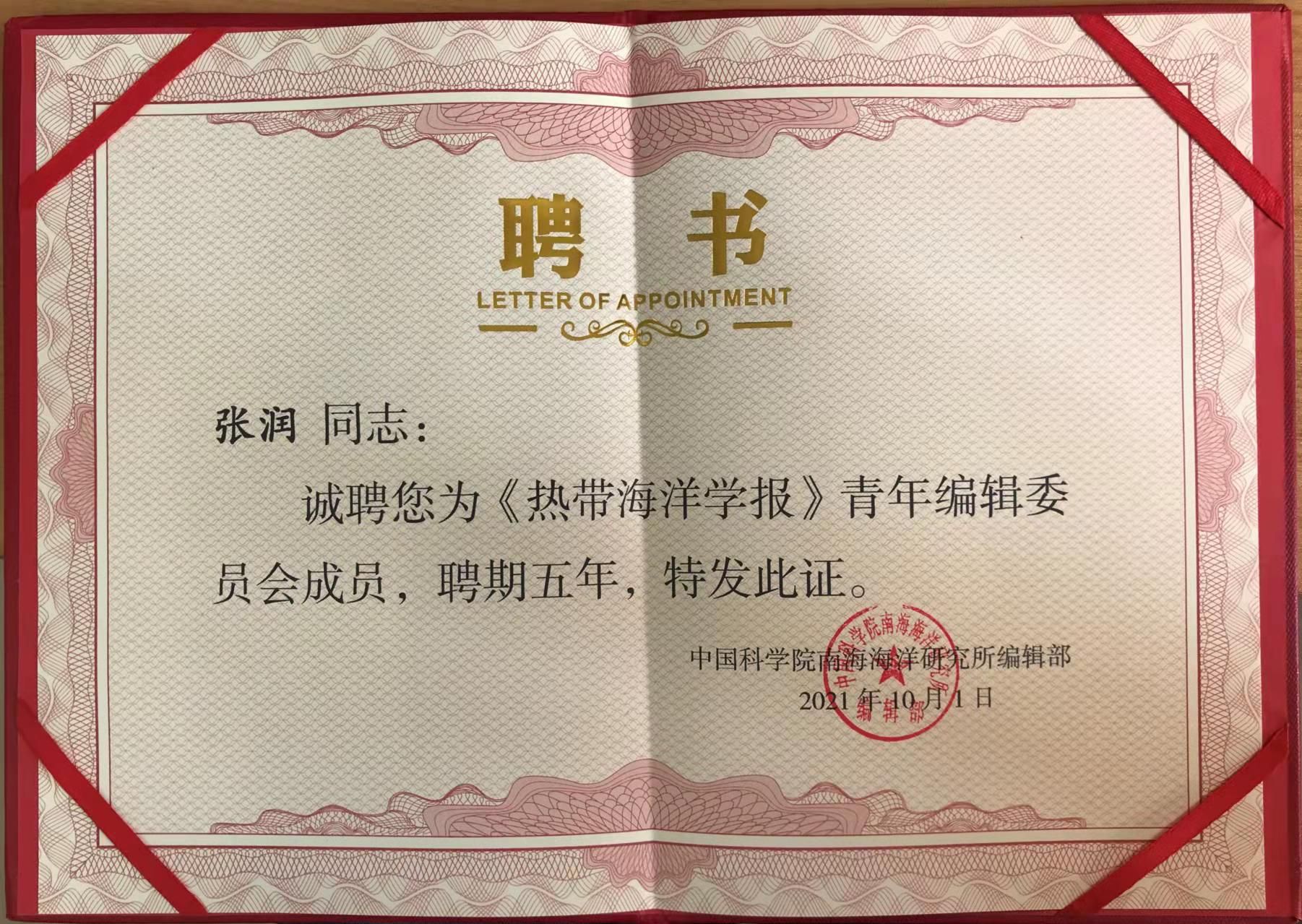 7、 张润被聘为《热带海洋学报》青年编辑委员会成员,中国科学院南海海洋研究所编辑部,2021年10月。