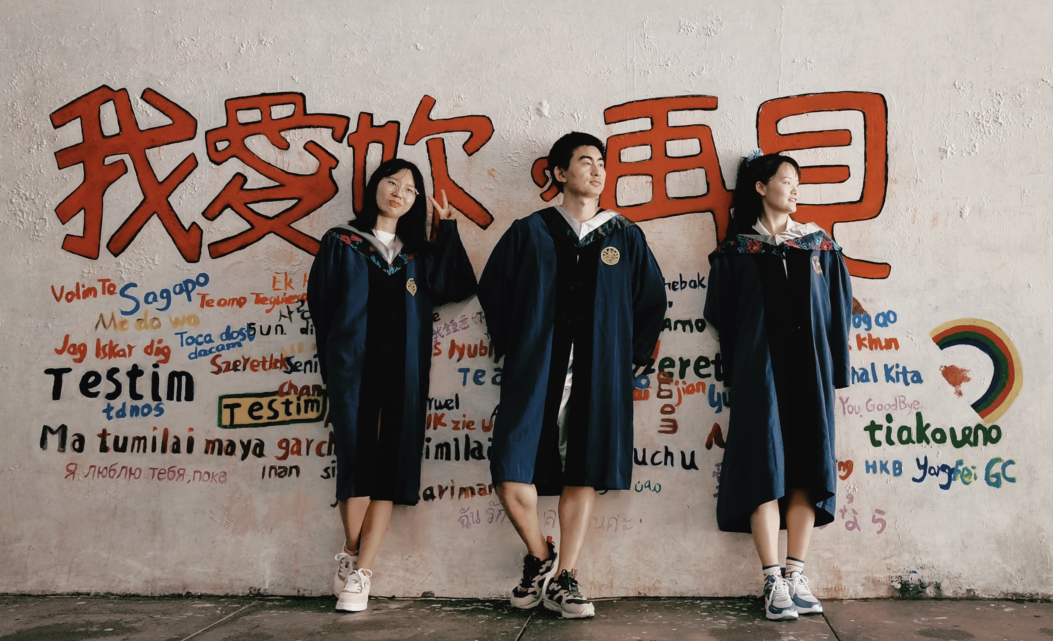 田杰、赵秀峰与杨伟锋老师在图书馆前合影 田杰、李琦与康佳雯在图书馆前合影