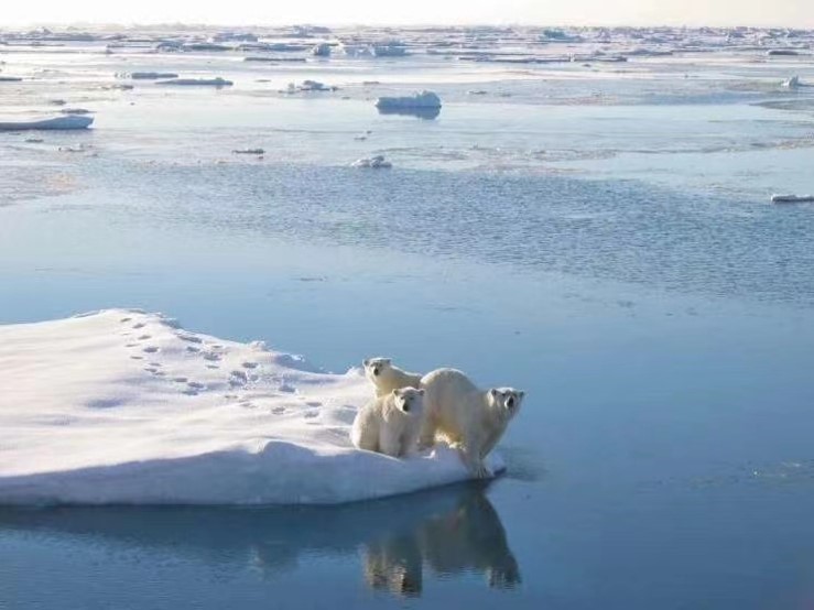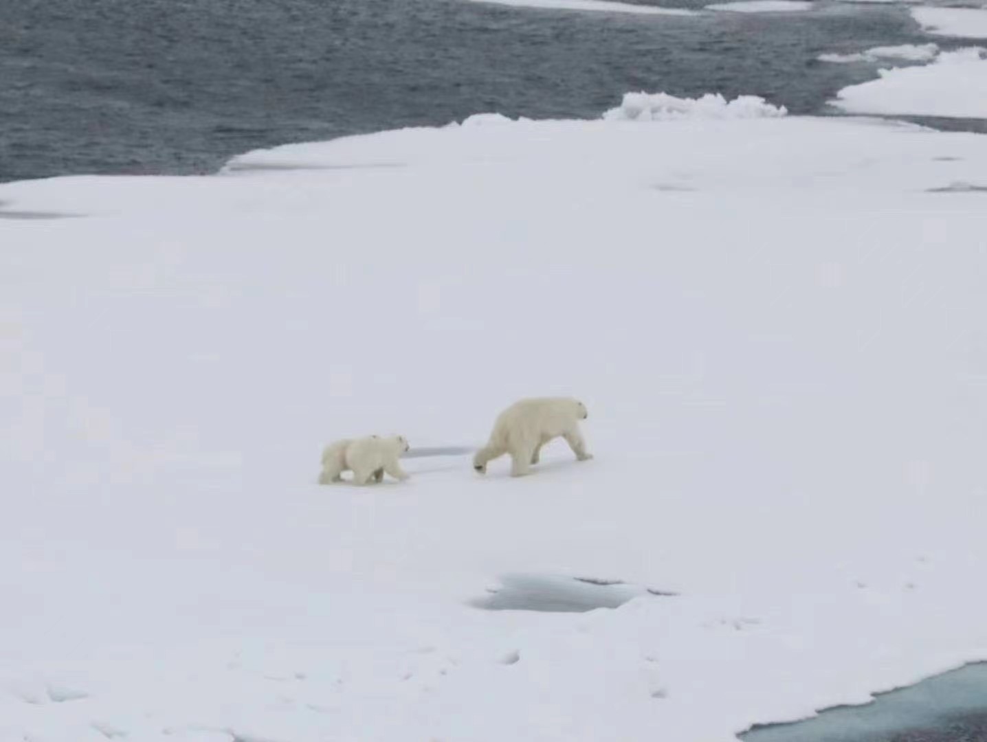 冰面上行走的北极熊一家 李琦在北冰洋冰面