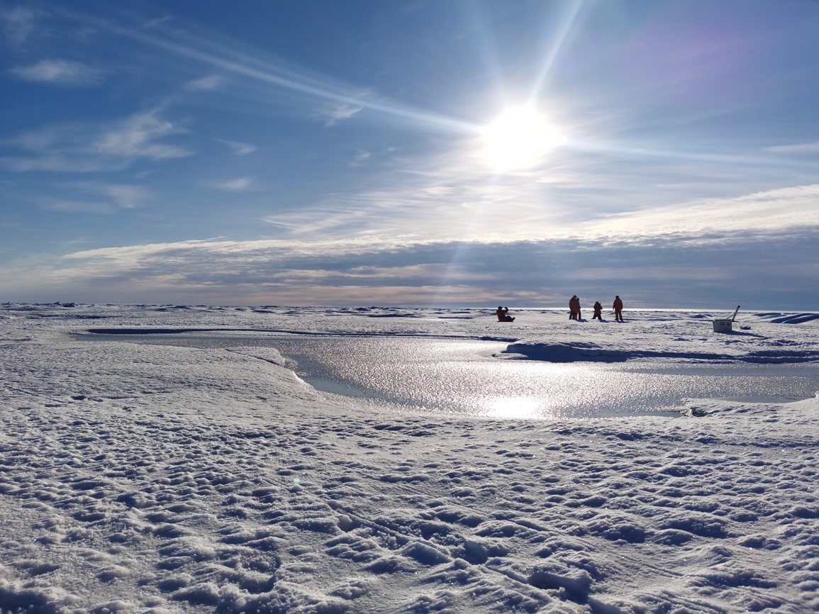 科考队员在冰上取样 北极熊遥望“雪龙2号”