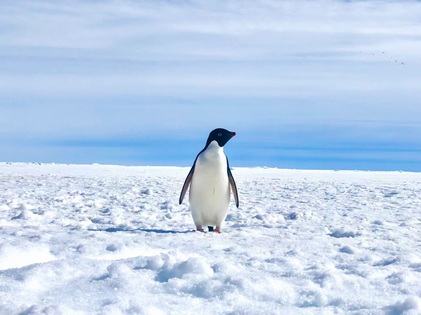 瞬息万变的云与广袤的冰原 一只在遥望远方的企鹅