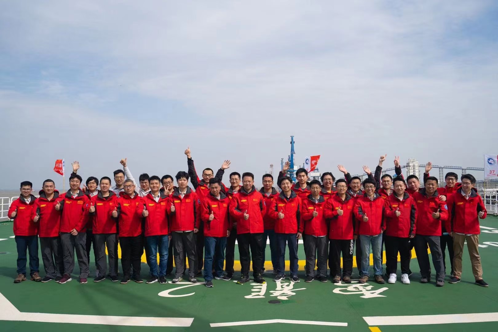 出航前陈光辉、李琦与“雪龙2”合影 陈光辉(左二)与队友