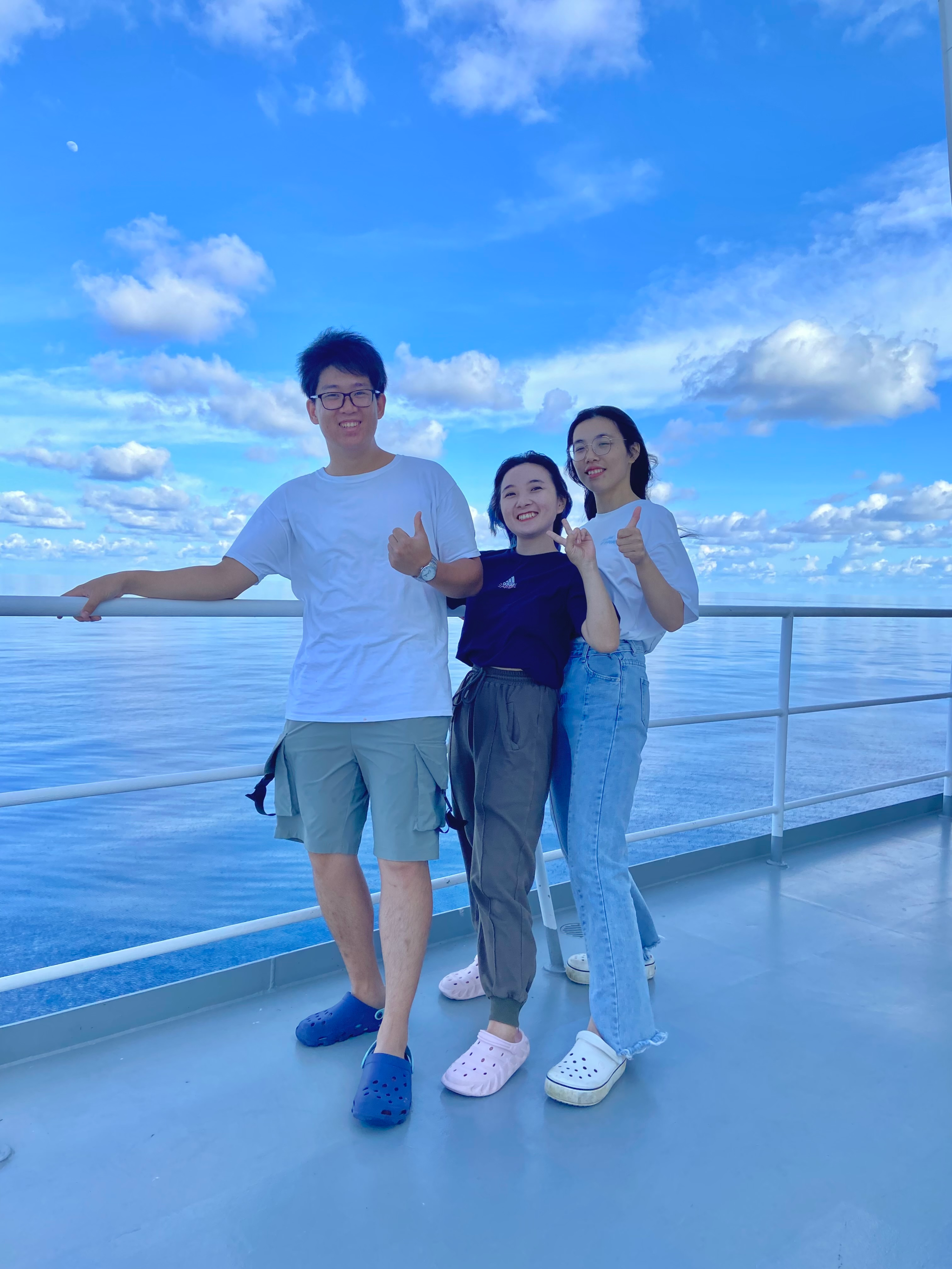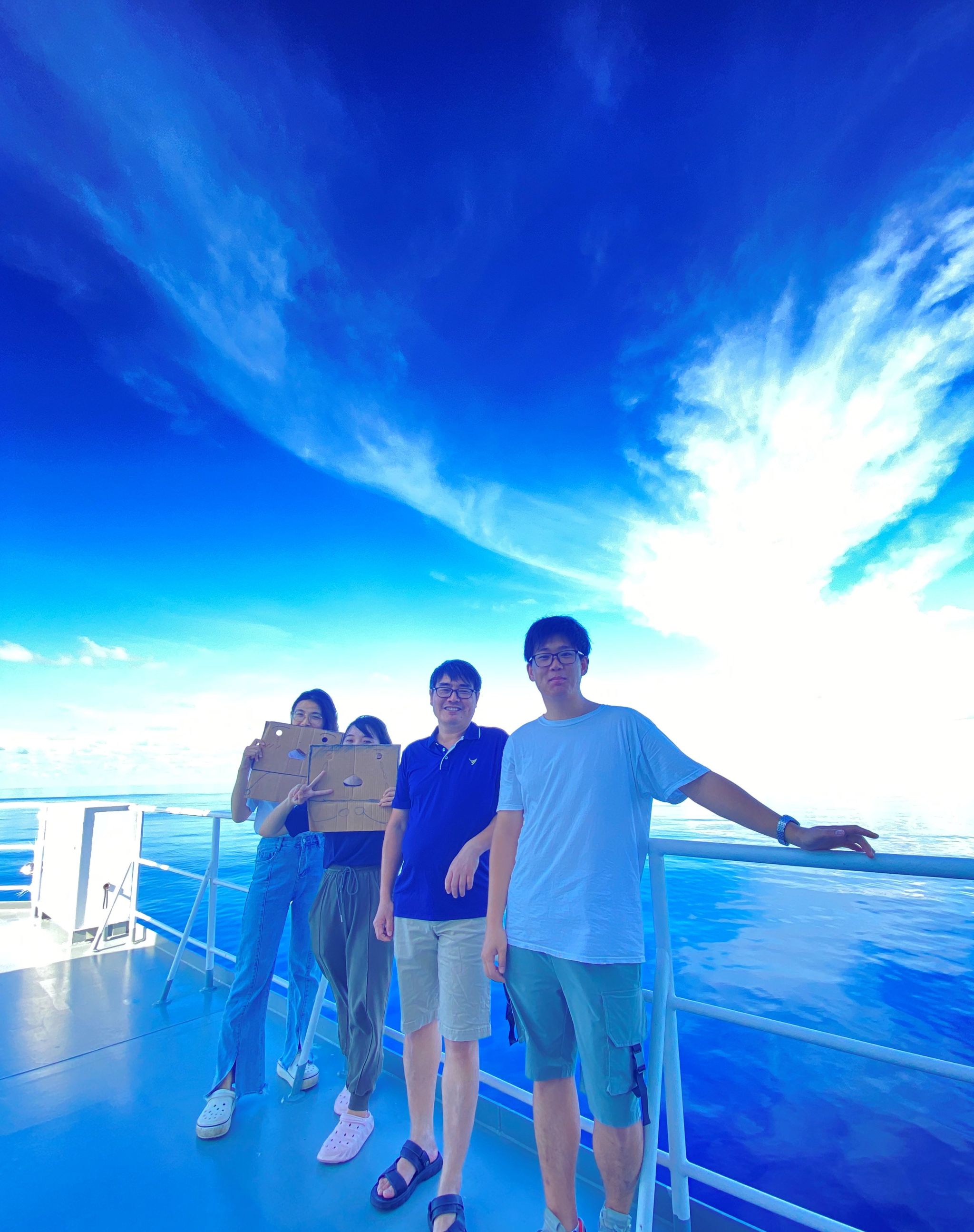 李佳旭(左一)、马露琦(右一)准备下放大体积泵 科考队员们完成沉积物采集时的合影(左二李佳旭,右一马露琦)马露琦、林娜、蔡毅华、李佳旭合影
