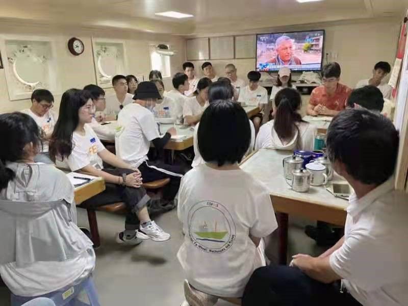 船上所拍落日下的风力发电站 船上的第一次航次会议