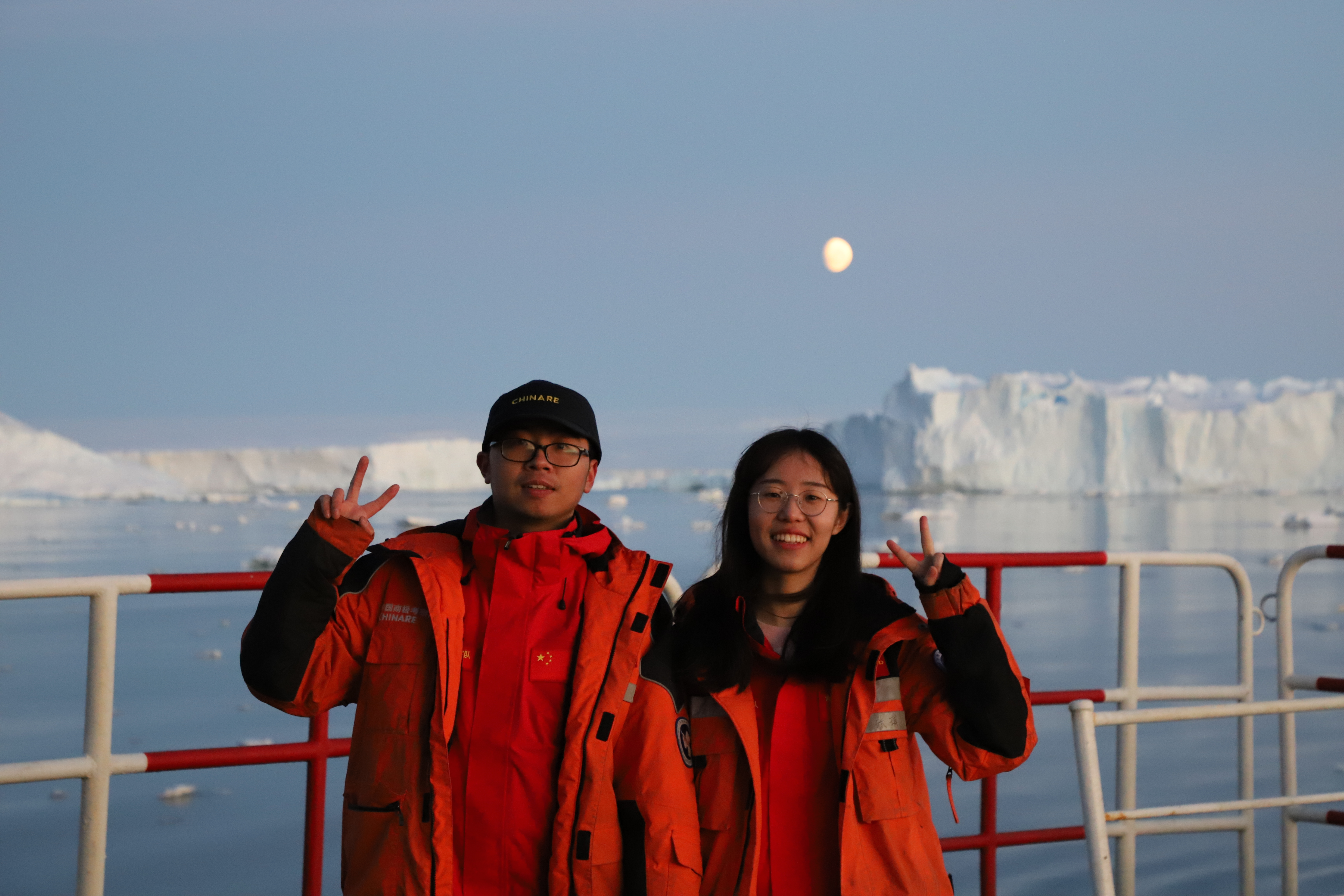 张琪在黄河艇上留影 薛思佑和张琪在冰山前合影