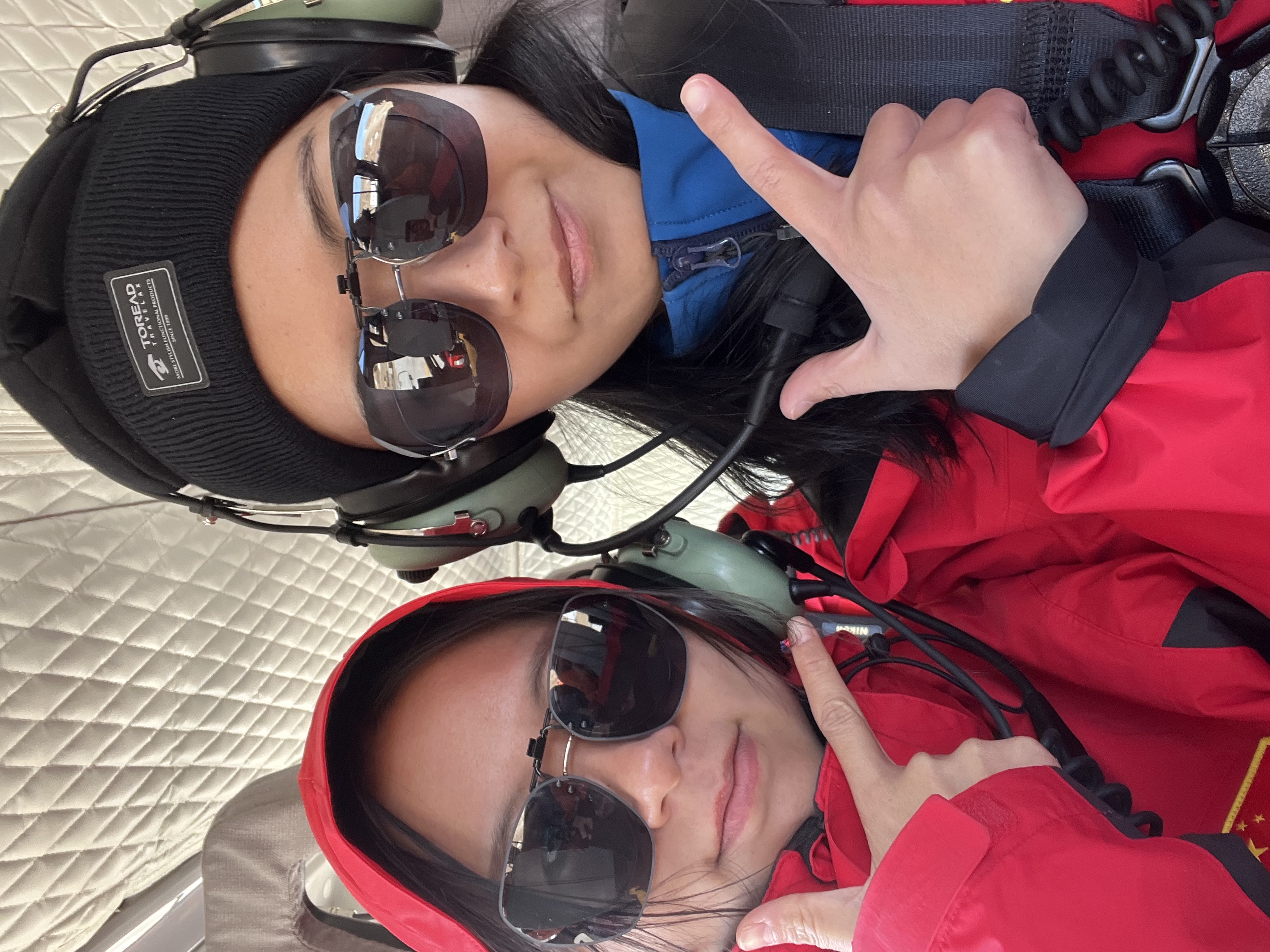 冯娅婷在冰上与“雪龙2号”合影 綦倩倩与船上的直升机合影 冯娅婷和綦倩倩在直升机上自怕
