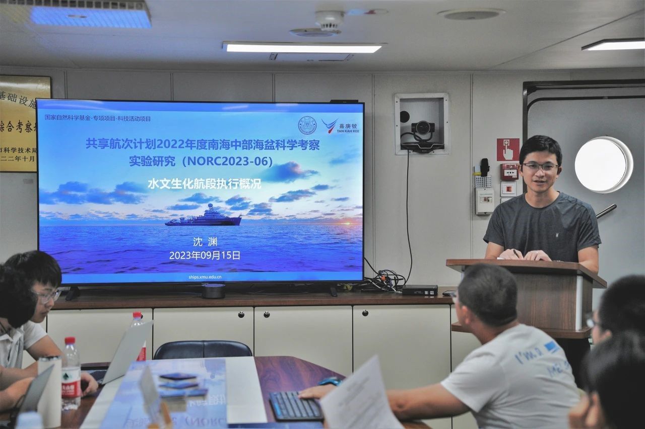 沈渊首席在做航次执行概况的汇报 |  林泽恒在过滤水样 |