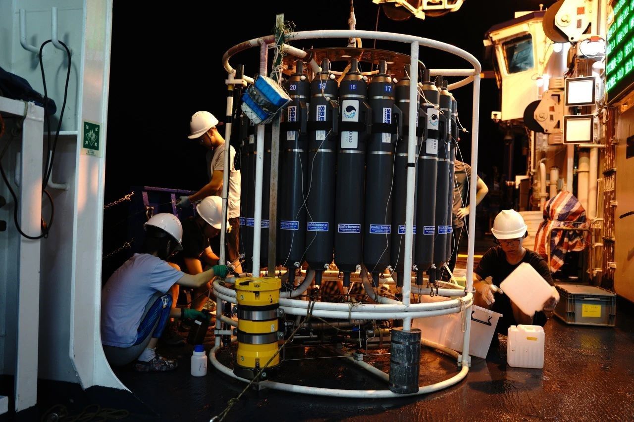 科考队员接取CTD采集的海水 |  科考队员在做大体积泵下放准备 |