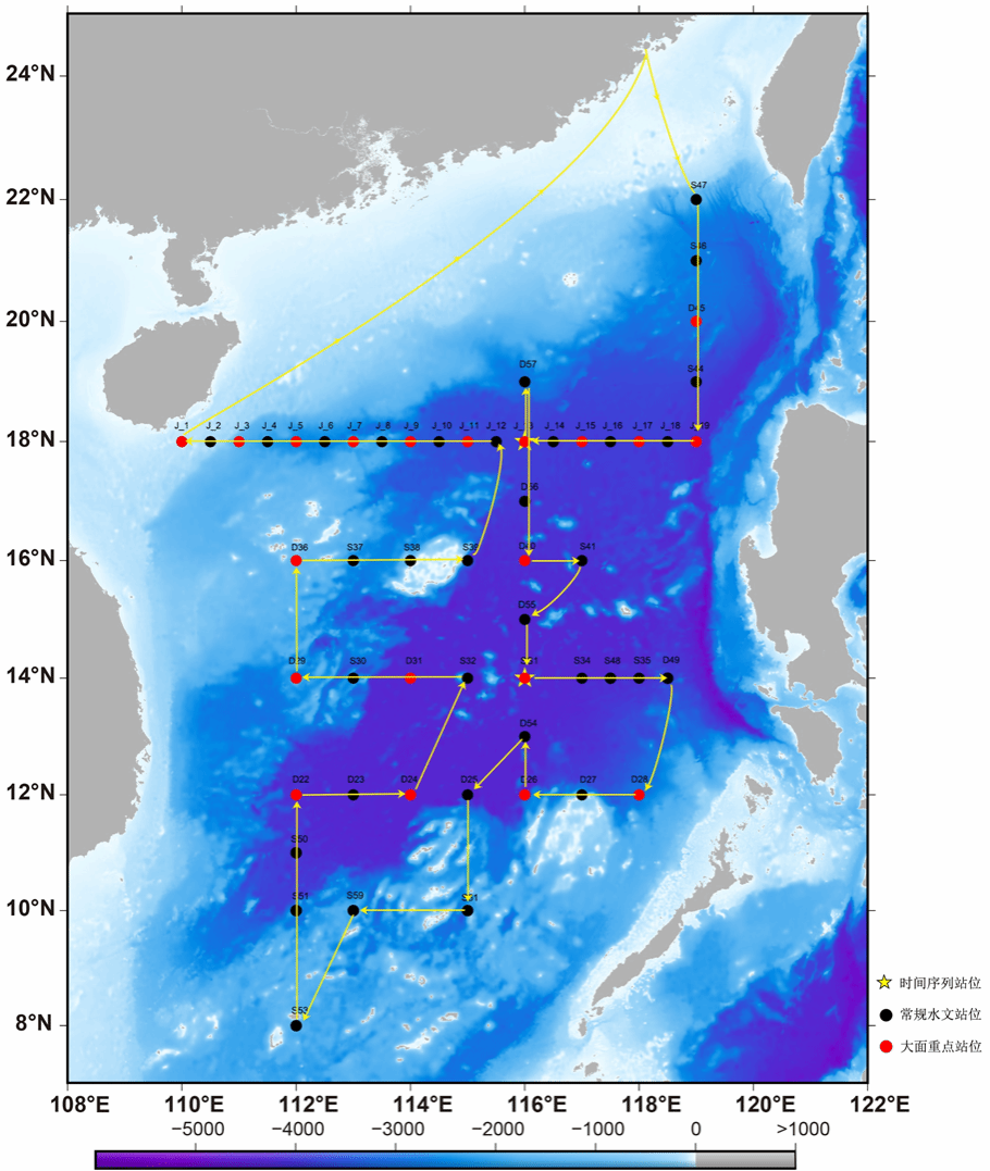 国家自然科学基金委“共享航次计划2022年度南海中部海盆科学考察实验研究(航次编号:NORC2023-06)”水文生化航段(KK2306),其重点是开展南海中部海域水文、大气化学、海洋化学、海洋生物和生态等多学科的重要与典型断面的调查与取样,旨在深入理解南海中部海盆生源要素循环和生物生态系结构功能的空间差异及其关键调控因子,厘清南海中部海盆环流模式、动力过程及大气—水文—生物化学耦合作用机制,同时增进海洋科学研究领域内的多学科交叉与融合,促进科研人员的交流与合作,推动重大科研成果的产出。厦门大学近海海洋环境科学国家重点实验室沈渊副教授担任本航次的首席科学家。为最大程度实现各搭载项目的研究目标,航次汇总各组采样需求并整合为四类调查内容,包括水文调查(如南海北部或中部海盆的温、盐、流场等数据获取)、生物地球化学调查(如溶解氧、营养盐和叶绿素等公共基础参数,以及碳酸盐体系、溶解态和颗粒态有机碳、有机氮的浓度组成、稳定同位素信号和海水痕量气体CFCs等数据)、生物生态调查(如微生物丰度、群落结构与功能调查,浮游植物光合色素、浮游植物丰度、初级生产力及群落结构特征、微型浮游动物的多样性及时空分布等)、大气物理化学调查(如低空大气折射率廓线重构、气溶胶沉降对南海细菌群落的影响、大气冰核凝华冻结性能及其理化特征等)。